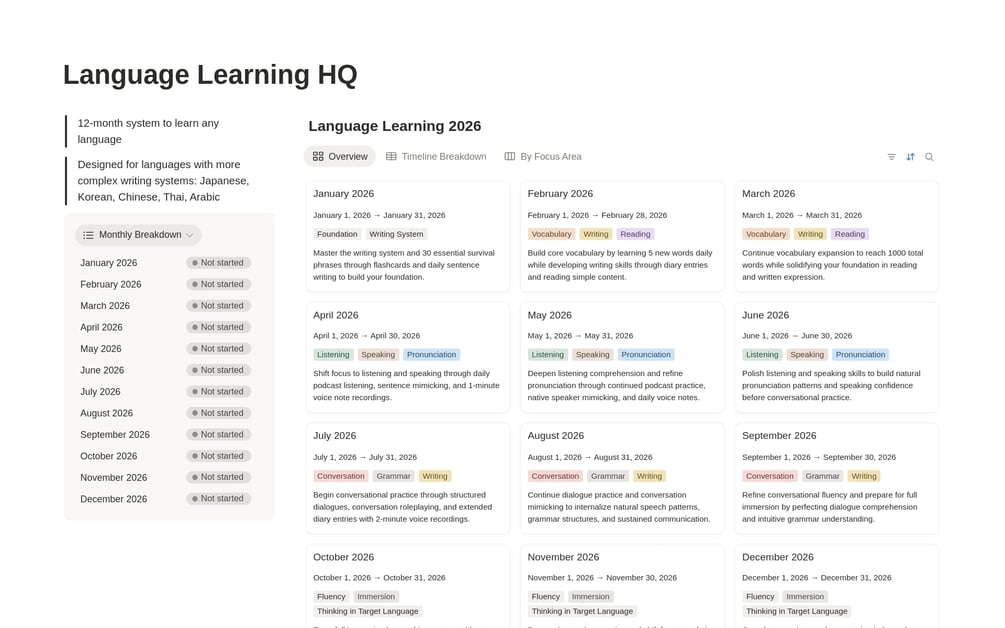 - Months 1-3:Build foundation with writing system, vocabulary, and reading