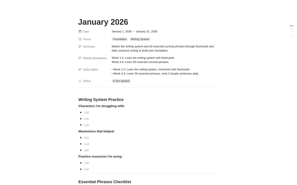 Note: Each language is different. I modify this template based on what I'm learning. If the language's writing system is similar to English (e.g. European languages), month 1 usually lasts 1 day.