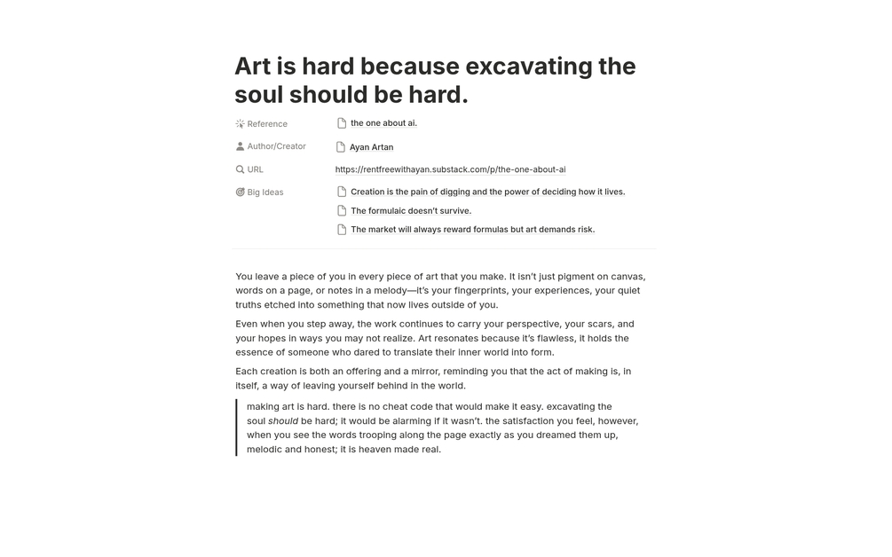 - Build arguments slowly through accumulated reflection. Start with a big idea or central theme, then layer in notes and insights over time. Your essays become richer because they're grounded in thoughtful engagement with what you've consumed, not rushed output.
